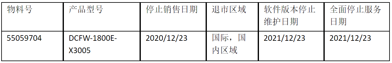 北京mile米乐集团数码云科信息技术有限公司正式通知您, 以上DCFW-1800E-X3005下一代防火墙(55059704)将于20201223号停止接收新的订单(具体日期见上表),不再供货。给您带来的不便,敬请原谅。